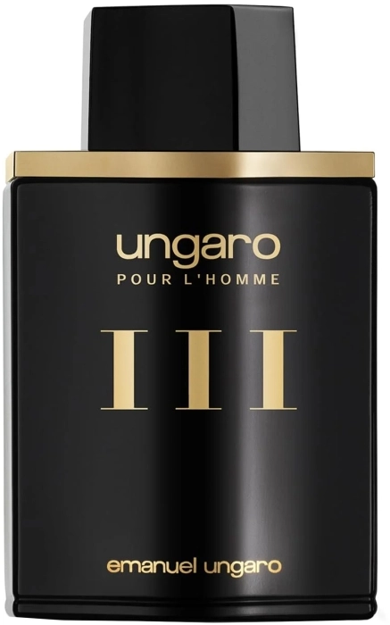 Ungaro pour l'Homme III es una fragancia con toques amaderados y florales, diseñada para hombres con personalidad y exigencia. La botella presenta un diseño clásico en negro con elegantes detalles dorados. Creado en 1993, este eau de toilette comienza con una mezcla de naranja, madera de caoba, cilantro, lavanda, vodka, salvia y limón. En su corazón, se despliegan notas de jazmín, lirio de los valles, rosa y geranio. Finalmente, se cierran con acordes de sándalo, pachulí, almizcle, musgo de roble, vetiver y cedro. Ideal para las veladas de otoño e invierno.