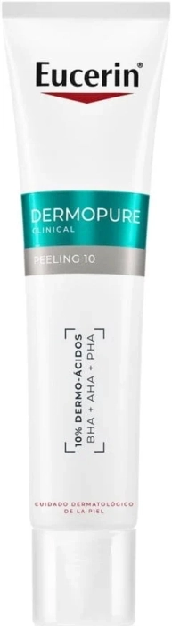 El Peeling Facial 10 DermoPure Clinical de Eucerin es un tratamiento nocturno que renueva la textura de la piel, indicado para pieles con tendencia a granitos. Contiene un 10% de hidroxiácidos BHA, AHA y PHA, que proporcionan una exfoliación efectiva y suave. Este producto ha sido recomendado por dermatólogos y está clínicamente probado para mejorar la apariencia de la piel y combatir problemas asociados con el acné. Se aplica sobre la piel seca después de la limpieza, evitando el contacto con los ojos.