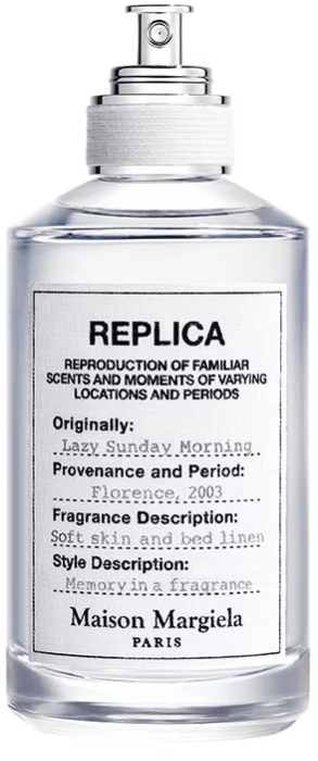 Eau de Toilette de Maison Margiela, de la colección Replica, con una fragancia femenina de la familia olfativa floral. Contiene notas de pera fresca, lirio del valle, iris y almizcle blanco, que evocan la sensación de una mañana soleada. El frasco presenta una silueta clásica de botica y una etiqueta de algodón, característica de la colección Replica